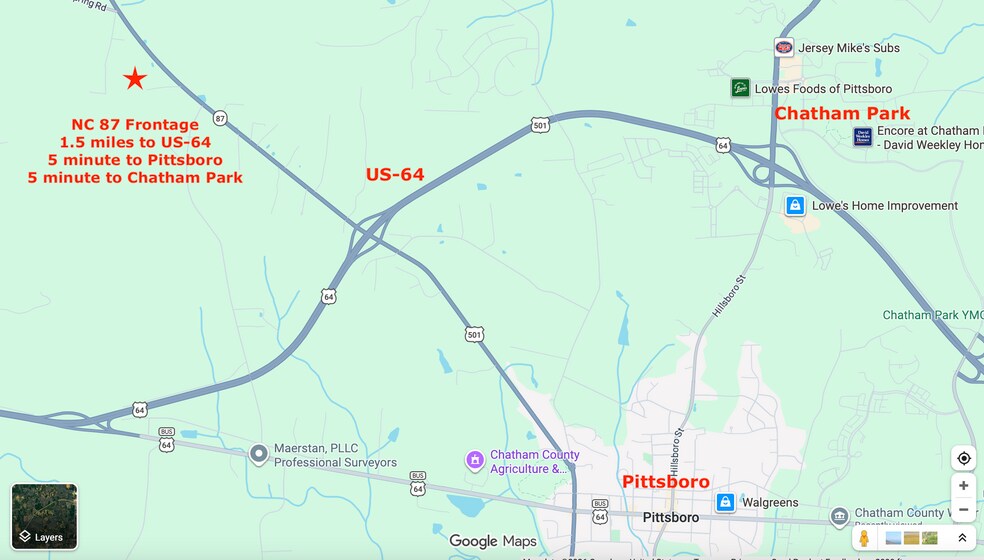 Property offers a unique combination of build-ready convenience and long-term upside in an area experiencing continued growth and development. Located approximately 1.5 miles from US-64 for convenient access to Pittsboro and surrounding areas.