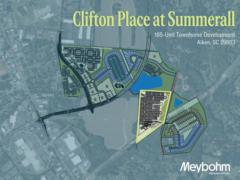 Clifton Place at Summerall is a shovel-ready, fully entitled townhome development located in the highly trafficked Whiskey Road corridor in Aiken, South Carolina. The ±35.18-acre site carries approved plans for 165 townhome units, delivering immediate vertical potential with no entitlement risk. Aiken has emerged as one of the Southeast's most compelling residential growth markets, driven by its proximity to Augusta, GA, an expanding employment base anchored by Savannah River Site, and sustained in-migration from higher-cost metros. New residential supply in the market has struggled to keep pace with demand, creating a favorable absorption environment for well-positioned product. The Whiskey Road submarket in particular benefits from strong retail node (6M annual visitors), making it a natural draw for the renter and entry-level buyer demographic that townhome product targets. With infrastructure constraints and limited available entitled land in South Aiken, Clifton Place represents a unique opportunity to enter a supply constrained market within Aiken's new premiere commercial mixed use development.