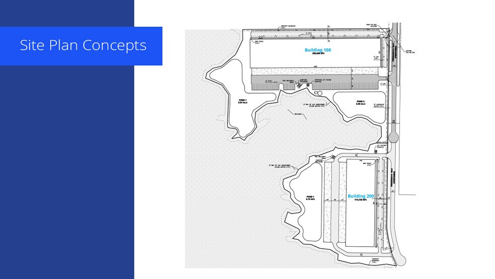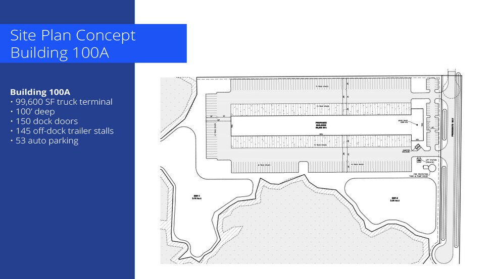 Flexible opportunities for the site include but are not limited to: Building 100 • 262,080 SF distribution facility • 240’ deep • 185’ truck court for off dock trailer storage Building 100A • 99,600 SF truck terminal • 100’ deep • 150 dock doors • 145 off-dock trailer stalls • 53 auto parking