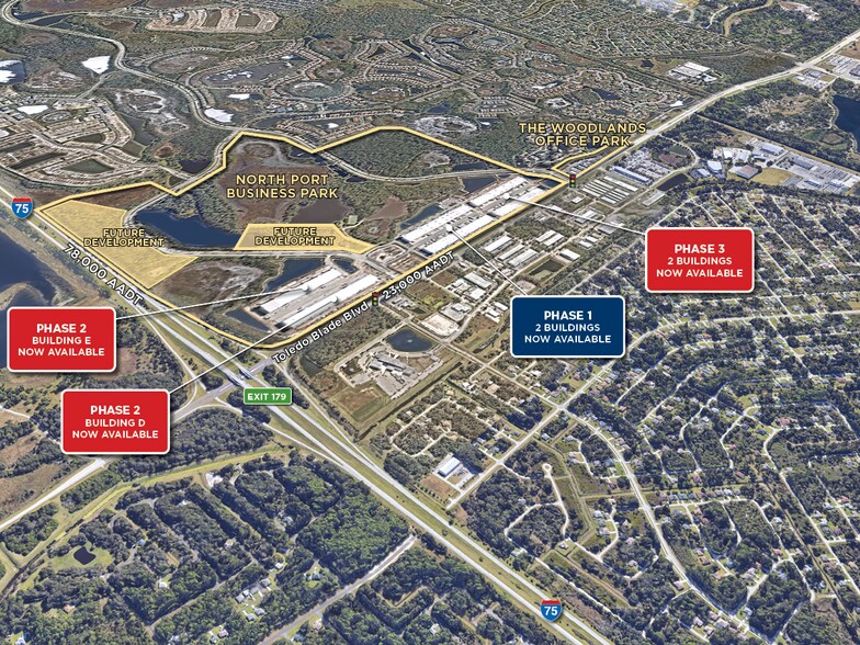 Bien situé le long du boulevard Toledo Blade, à seulement 800 mètres de l'I-75, la phase 1 du parc d'affaires de North Port apporte 285 000 pieds carrés d'espaces industriels légers, d'entrepôts flexibles et de bureaux de classe A dans le sud du comté de Sarasota. Premier du genre à North Port, le bâtiment offre une visibilité sur l'autoroute, une hauteur de plafond dégagée de 30 pieds, un large espacement entre les colonnes, un chargement à hauteur du quai, un système de gicleurs ESFR, une alimentation triphasée de 480 V, un éclairage LED économe en énergie, des espaces en plein air et un vaste parking sur place. La phase 2, disponible en juillet 2023, répond au besoin d'espaces industriels légers et d'entrepôts de la ville, connu comme « le moteur de la main-d'œuvre de la région métropolitaine » en raison de sa main-d'œuvre civile de 28 688 personnes.