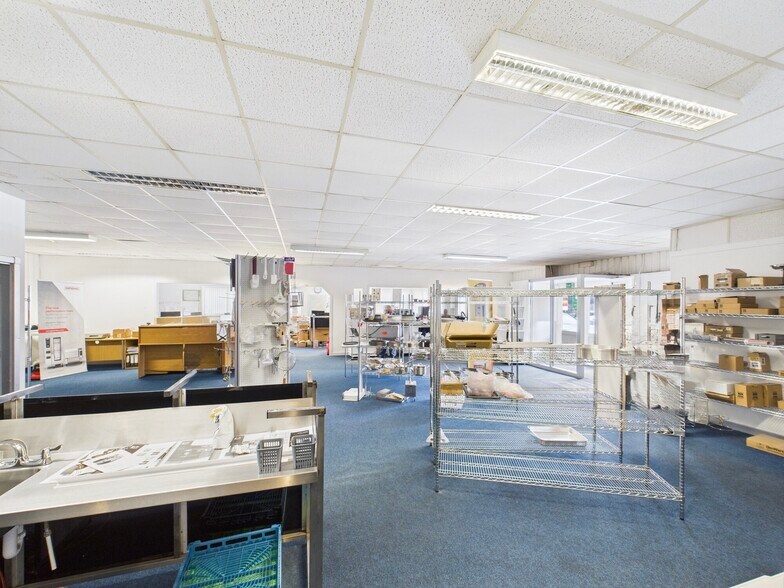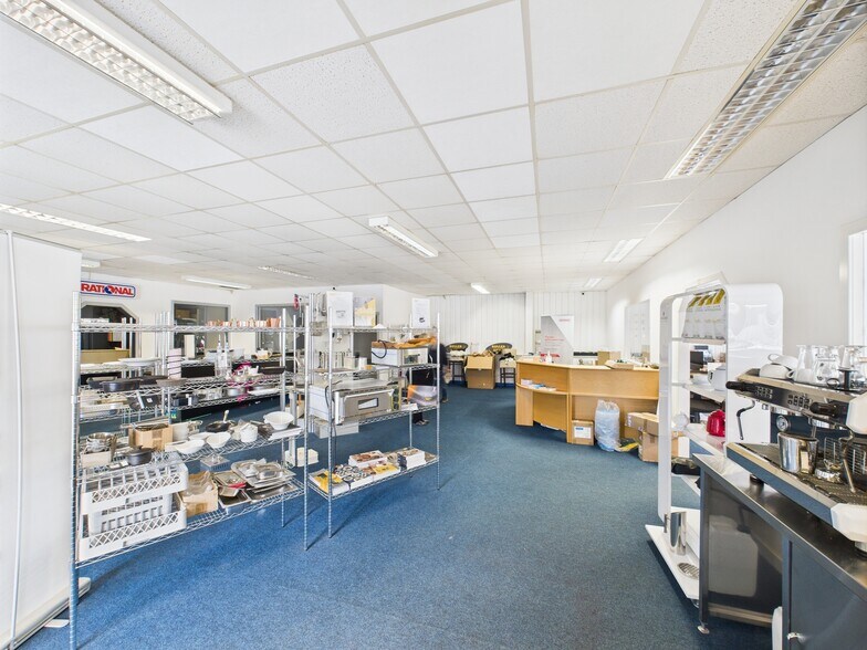 The subjects comprise the front section of an industrial property, currently fitted out as a showroom and trade counter. The building is of steel portal frame construction with harled masonry to dado height and profiled metal cladding above. The front elevation includes full-height glazing to the showroom area. Internally, the accommodation provides a large open-plan showroom, a series of offices, private meeting rooms, and a rear workshop/store. Staff facilities include a kitchen, toilets, and breakout areas. The layout supports a mix of customer-facing retail and back-office or light industrial functions. The building is fitted with solid floors, a mix of surface-mounted and perimeter trunking, and standard lighting. It is suitable for a range of commercial uses, including trade counter, showroom, or hybrid operations. Externally, there is on-site car parking to the front and side of the building, offering generous parking provision and space for deliveries.