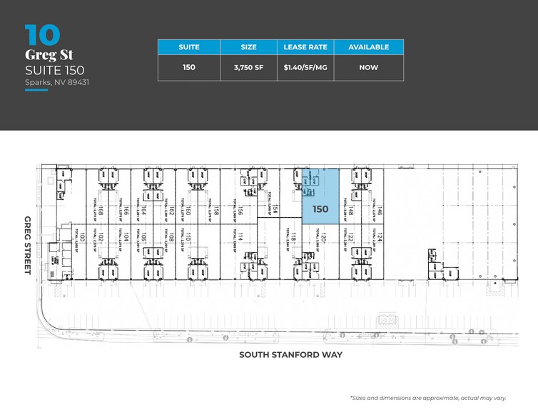 DCG is pleased to present 10 Greg Street for lease. This industrial flex unit is available immediately and offers functionality, visibility, and excellent regional access within the Sparks industrial market. The property features large 12’ x 14’ roll-up doors and is located within a well-maintained, multi-tenant industrial facility offering strong visibility and convenient connectivity to I-80, Industrial Sparks, the Tahoe-Reno Industrial Center (TRIC), and the Southeast Connector. Situated at the corner of E. Greg Street and Stanford Way, the property benefits from proximity to numerous retail, restaurant, and hospitality amenities.