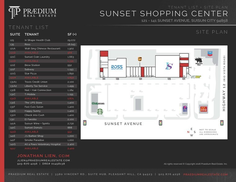 Le centre commercial Sunset est un centre de 86 000 pieds carrés dont les principaux locataires sont In Shape Fitness et RiteAid. Il y a un fort trafic dans le centre avec Starbucks, McDonald's, Taco Bell et Black Bear Diner. Excellent accès depuis l'autoroute 12 et Sunset Avenue avec plusieurs intersections signalisées. Grande circulation dans le centre et parking abondant.
