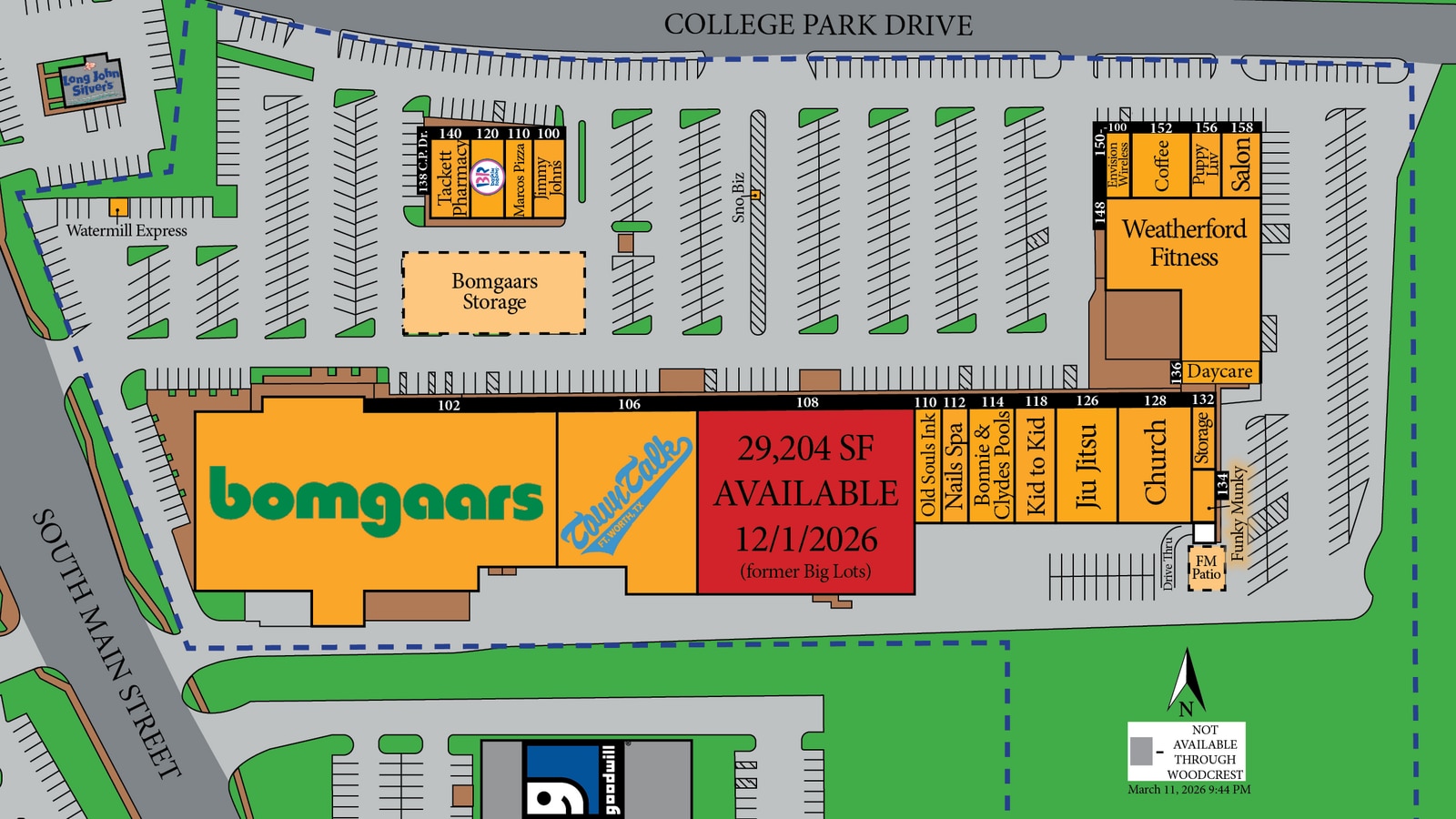 Le College Park Center est un centre de style de vie d'environ 151 000 pieds carrés situé sur South Main Street et College Park Drive à Weatherford, au Texas. Le centre compte un mélange unique de locataires nationaux et régionaux, dont Bomgaars, ce qui en fait l'un des centres commerciaux les plus fréquentés de la ville en pleine expansion de Weatherford. Le centre commercial College Park est situé en face du Weatherford College et à quelques minutes de Walmart, Home Depot, Target et d'autres grands magasins. Les suites commerciales de ce centre sont disponibles à la location pour tout, qu'il s'agisse de vitrines de magasins de détail et de restaurants traditionnels, de bureaux ou de prestataires de services médicaux ou autres professionnels. Woodcrest Capital accueille les nouvelles entreprises et les franchisés dans ses centres grâce à des contrats de location faciles à lire et à des conditions flexibles. Woodcrest est également suffisamment sophistiquée pour satisfaire les plus importants locataires du secteur du crédit national. En tant qu'entreprise familiale avec plus de 40 ans d'expérience dans l'immobilier commercial, Woodcrest possède et exploite tout, des centres de classe A dans les quartiers les plus animés aux centres en difficulté qu'elle réhabilite dans des communautés rurales en difficulté. Appelez-nous dès aujourd'hui pour trouver le bon emplacement pour votre entreprise, car nous avons généralement de nombreuses opportunités de vente au détail dans les environs immédiats !