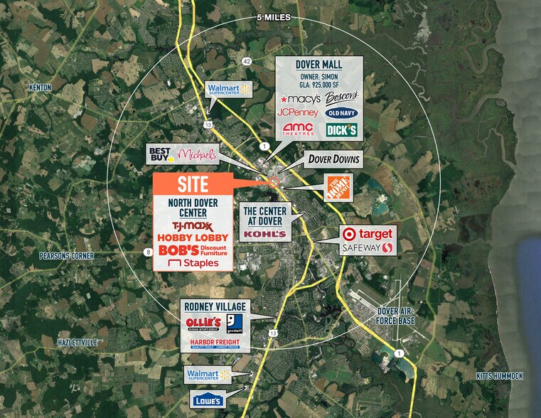 Le North Dover Center, situé sur la Route 13, est une destination commerciale de premier plan de la région, située à côté de Bally's Dover et du Dover International Speedway. L'université d'État du Delaware se trouve également de l'autre côté de la rue et le centre se trouve à quelques minutes de la base aérienne de Douvres. Le centre commercial de 191 973 abrite de nombreux détaillants nationaux, notamment Hobby Lobby, Verizon Wireless, Bob's Discount Furniture, Staples, Books-A-Million, T.J. Maxx, Kirkland's, Sally Beauty et Cold Stone Creamery. En outre, le centre dispose d'un grand parking, d'un pylône monumental à proximité de la Route 13 et accueille plus de 74 000 véhicules par jour.