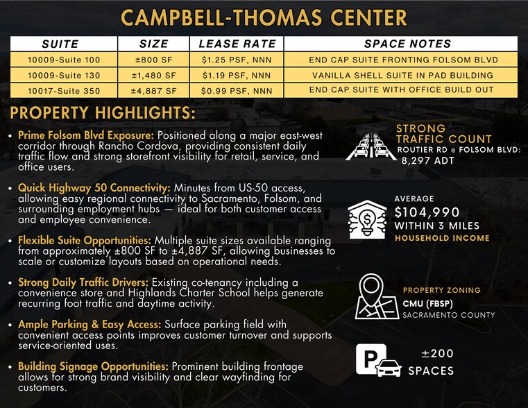 Campbell-Thomas Center offers ±800 to 4,887 SF of office and retail space along Folsom Boulevard in Sacramento. Three suites are available across two buildings — including an end cap with Folsom Blvd frontage, a vanilla shell pad building suite, and a larger end cap with existing office build-out. The center sits minutes from Highway 50, connecting tenants to Sacramento, Folsom, and Rancho Cordova's major employment corridors. Established co-tenancy with a convenience store and Highlands Charter School keeps steady foot traffic flowing throughout the day. With ±200 parking spaces, building signage opportunities, and flexible suite configurations, Campbell-Thomas Center is well-positioned for retail, service, and professional office users looking for visibility and accessibility.
