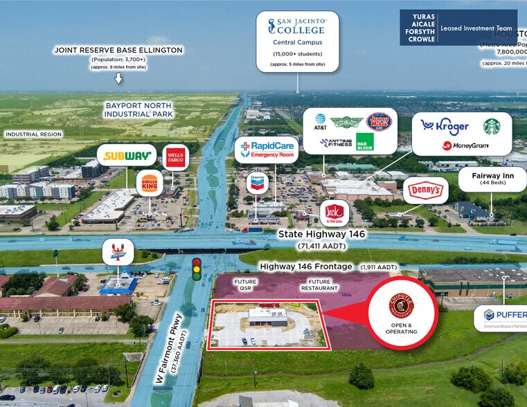 The property is strategically located at the hard corner of Highway 146 Frontage and W Fairmont Parkway, with excellent visibility and access to 37,000 vehicles per day directly in front of the property. W Fairmont Parkway provides immediate access to Highway 146 (71,411 AADT), which in turn connects to Highway 225 (90,659 AADT) just north of the property. Additionally, the property is supported by an affluent customer base, with an average household income of $135,889 within a three-mile radius. Positioned along the area’s major retail corridor, the property is near several notable retailers, including Kroger, Starbucks, AT&T, Anytime Fitness, Denny’s, and many others. The property is ideally located near major industrial employers such as LyondellBasell (800+ employees), ExxonMobil (400+ employees), and the Port of Houston (the busiest port in the U.S. in terms of tonnage). This Chipotle has beneficial proximity to San Jacinto College: Central Campus (15,000+ students) as well as many La Porte Independent School District schools,