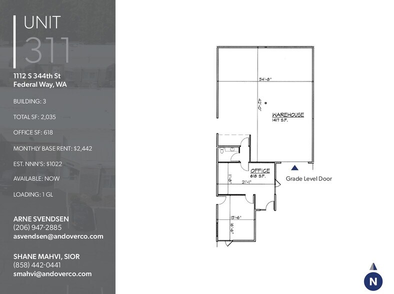 BUILDING: 2 Total SF: 2,064 OFFICE SF: 579 MONTHLY BASE RENT: $2,477 EST. NNN’S: $1,036 AVAILABLE: NOW LOADING: 1 GL
