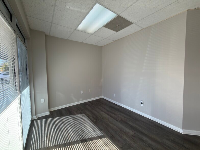 A professional office space with large offices, a spacious lobby, and a break area with room for a full-size fridge. This professional office space has new laminate floors and is turnkey for another professional service.