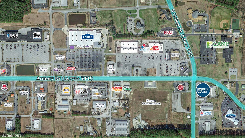 Former Rite Aid now available. Drive through. Signalized corner intersection with two curb cuts. 219 bed Bon Secours Community Hospital and Camp Community College nearby.