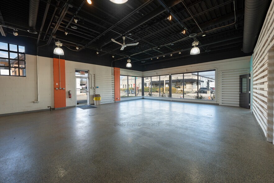 Retail showroom & rear clear-span flex space with 18' ceilings and loading access