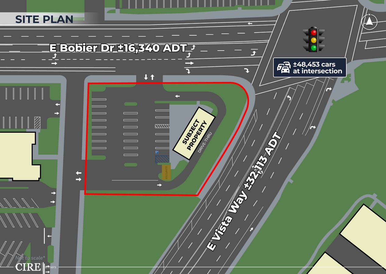 FULLY BUILT-OUT RESTAURANT SPACE Turnkey second-generation QSR with drive-thru, hood system, grease trap, restrooms, and full kitchen infrastructure in place. HIGH-TRAFFIC LOCATION Located at the intersection of E Vista Way (±32,113 ADT) and E Bobier Dr (±16,340 ADT), with over 48,000 vehicles daily—surrounded by dense housing and key commuter routes. HIGH-VISIBILITY HARD CORNER Prominent standalone building at a signalized intersection with unrestricted access—no medians, U-turn bans, or turn limitations. Features two convenient ingress/egress points. AMPLE ON-SITE PARKING ±24 surface spaces (12.25/1,000 SF) provide ample parking for dine-in, takeout, and drive-thru traffic. ESTABLISHED VISTA RETAIL CORRIDOR Adjacent to multiple busy strip centers with strong co-tenancy synergy, reinforcing the site’s retail presence and consumer draw. PROXIMITY TO KEY COMMUNITY DESTINATIONS Located just north of Brengle Terrace Park, Alta Vista Botanical Gardens, and the Moonlight Amphitheatre—an iconic venue drawing 100,000+ annual visitors. Strong opportunity to capture catering, concessions, and fast to-go business tied to events and park activity. DENSE SURROUNDING POPULATION Immediate proximity to schools, neighborhoods, and employment hubs—ideal for capturing consistent daytime and evening traffic. IMMEDIATE OCCUPANCY Plug-and-play opportunity in a highly competitive retail corridor—perfect for operators seeking a quick market entry.