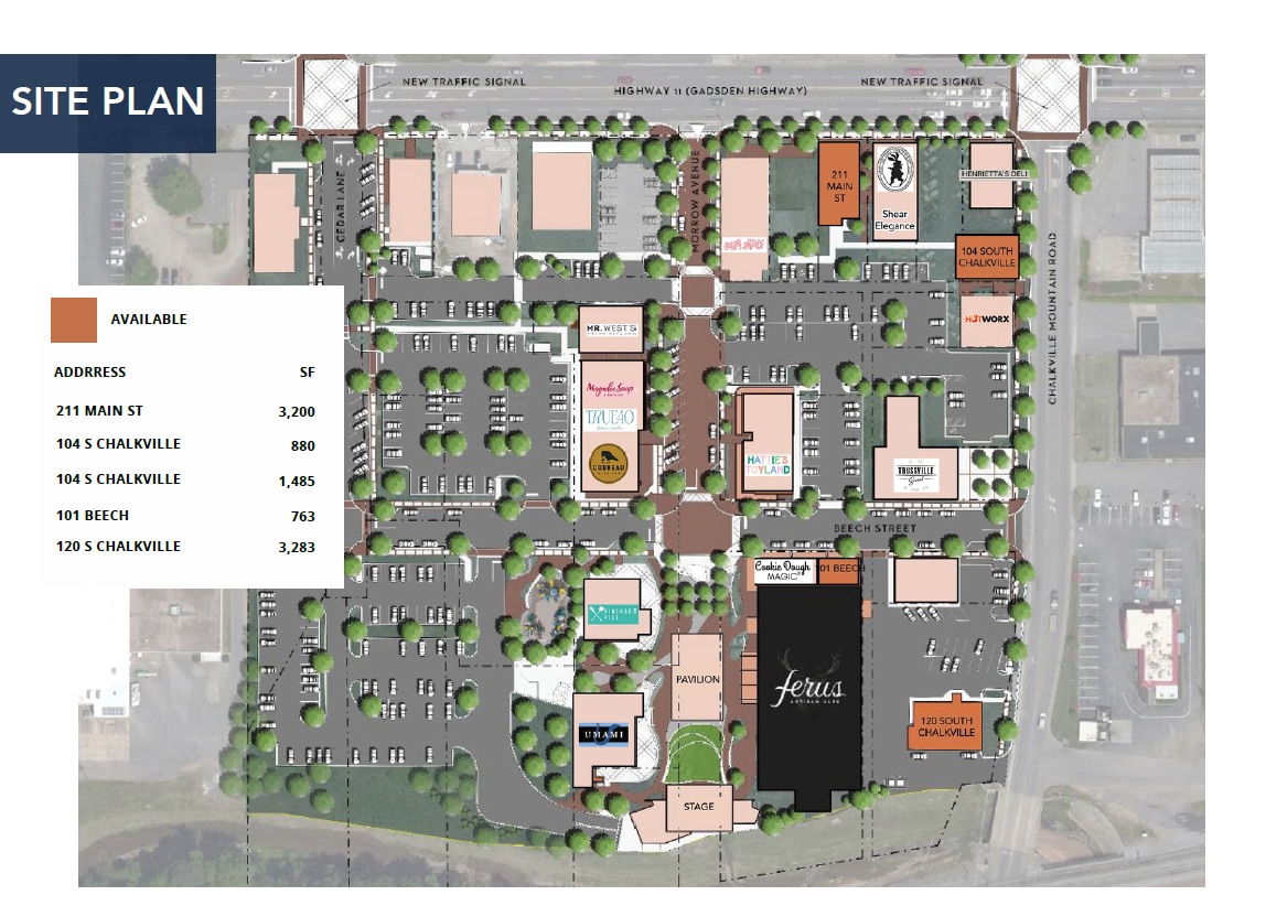 Located at the highly visible corner of Highway 11 and Chalkville Road, this 12-acre mixed-use district has transformed historic downtown Trussville into a vibrant destination for dining, retail, and community gatherings. The walkable development features a central event lawn with stage, covered pavilion seating, pedestrian-friendly streetscapes, public parking, and green space designed to host concerts, festivals, and year-round community events. Currently 5 spaces available ranging from 880 SF- 3,283 SF
