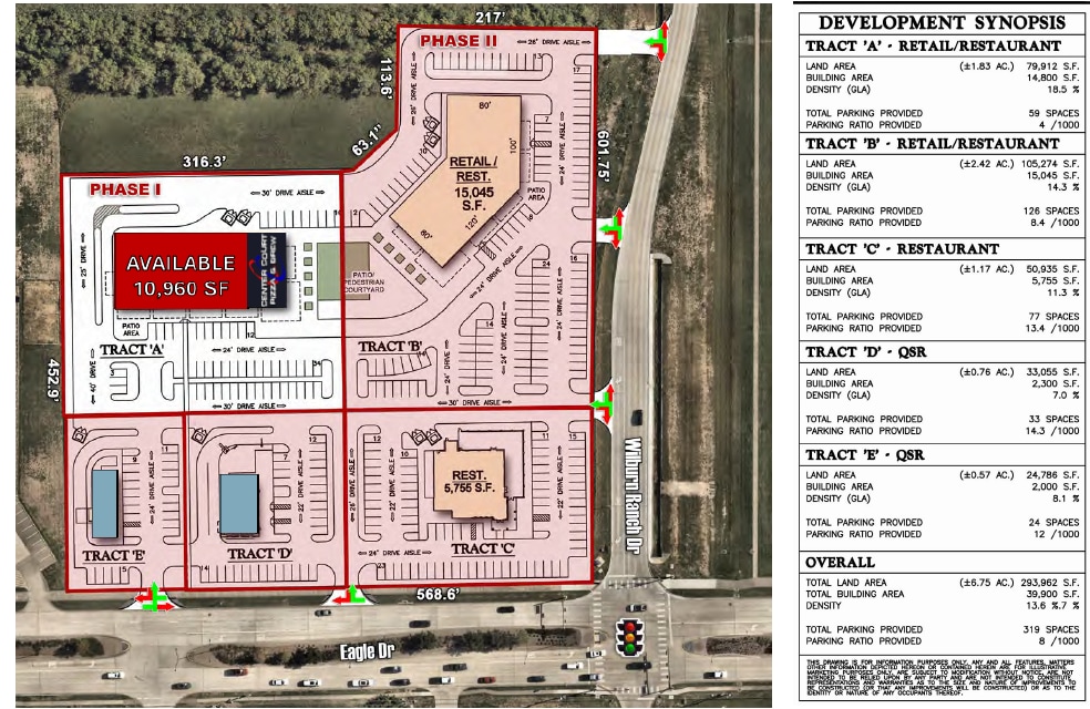 - 11,400 SF Available - $34.00 - $38.00 PSF - $10.00 NNN PSF - Patio/ Pedestrian Courtyard adjacent to space - Drive Thru - End Cap