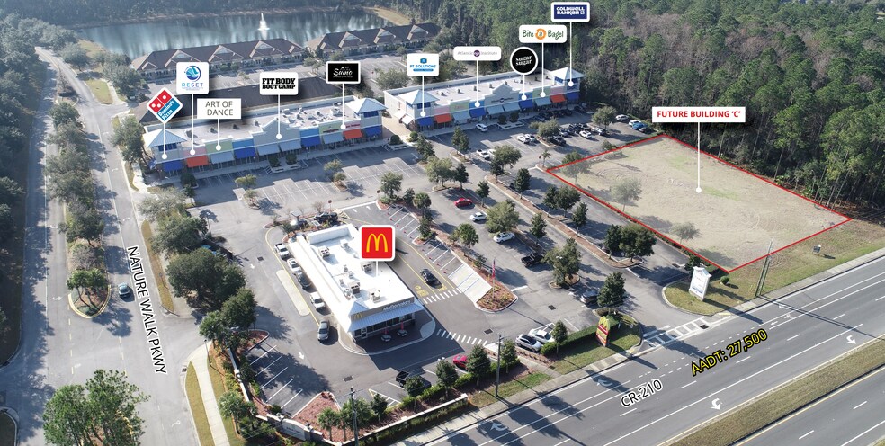 » 1,200 - 9,600 SF Office/Retail Space for Lease » Building C Coming Soon — Summer 2026 » Positioned 5 miles north of Baptist Health’s 33.75 Acre medical campus development » Located in the growing and affluent CR 210 trade area in northwest St. Johns County » Average household incomes exceeding $110,000 within a 5-mile radius » Easily accessible from both CR 210 & Nature Walk Parkway, which offers direct access from the 583-home golf community, Johns Creek
