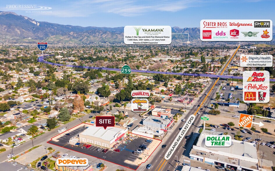 Progressive Real Estate Partners is pleased to present the opportunity to acquire a single-tenant discount retail investment located along Highland Avenue in San Bernardino, one of the city’s primary east-west retail corridors serving a dense, established urban trade area. The property is offered at an attractive 7.15% in-place cap rate, providing a strong in-place yield from a necessity-based retail use that benefits from high-frequency visitation and resilience across economic cycles. The property is centrally located between I-215, I-210, and State Route 259, providing exceptional regional connectivity. The site is positioned directly across from Home Depot and Stater Bros., driving consistent daily traffic to the immediate trade area. Situated within a dense, infill urban corridor with limited competing retail land available for future development, the location supports long-term tenant demand and durable occupancy. In addition, the property features an on-site recycling center that provides a supplemental income stream, further enhancing the overall yield. With strong surrounding population density, ±159,280 residents within a 3-mile radius and nearly 350,000 residents within a 5-mile radius, the asset is well positioned to benefit from sustained, repeat consumer demand in a well-established urban retail trade area.