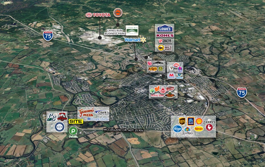 This property is off Frankfort Road/McClelland Circle intersection across from both Great Crossings High School and the new Publix development, 6.7 miles from the Toyota Manufacturing Plant (+/- 9,500 employees), and 15 miles north of Lexington, KY. Consistently one of the fastest growing markets in KY, Georgetown continues to see growth in housing, multi-housing, office, retail, and industrial sectors of the market.