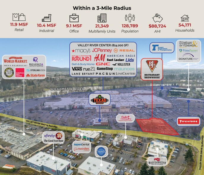 - Outparcel to Valley River Center (814,000 SF) | Anchored by JCPenney, Macy's, Regal Cinemas & Round One Entertainment