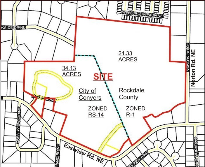 Prime, 58.46 acre residential development site, and possible potential for retirement community or assisted living. Close proximity to Piedmont Rockdale Hospital, and the numerous medical facilities, specialists, rehab centers, and doctors’ offices that surround the hospital and this property. 34.13 acres zoned RS-14 (in City of Conyers) and 24.33 acres zoned R-1 (in Rockdale County). 4 Parcel ID's: 1) 0670020001 (28.48 acres). 2) C330030003 (27.19 acres). 3) C33003003B (0.63 acre). 4) C33003003A (0.52 acre)