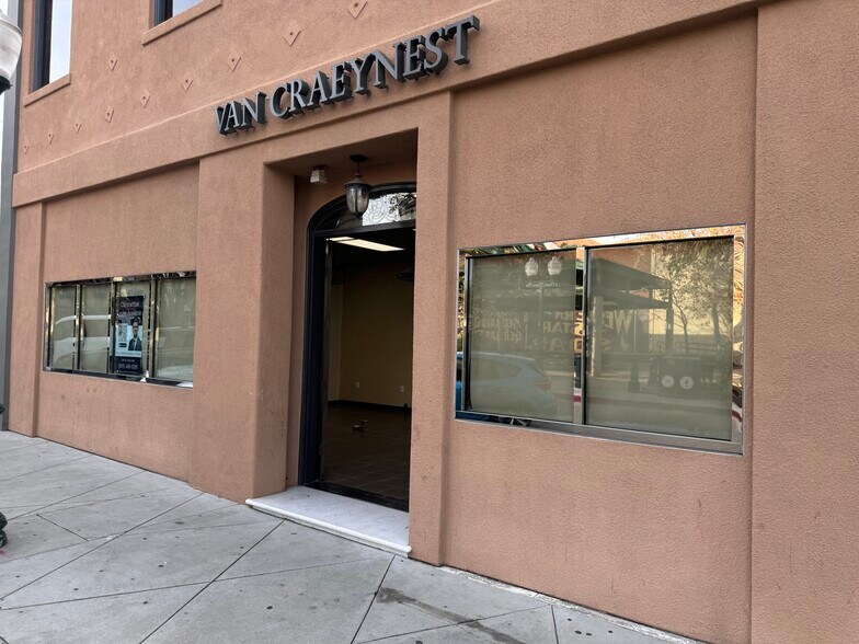 For commercial lease - Prime Historic Downtown Redlands Location! Walkable district with tons of foot traffic. Perfect for any business! 515 square foot ground-level suite in a gorgeous brick building with a painted facade. Located right between the "Love Wall" landmark and Molinos Coffee, across from a prime Downtown Redlands parking lot. Beautifully carved double door entry with a charming porch light. Stunning ceiling and large windows. There is large signage above the door, with electrical for the sign. Electricity and water are connected and available for 3+ salon stations. A restroom can be installed, but a common shared restroom is available. Don't miss this opportunity to set your business up for high visibility and foot traffic right here in Historic Downtown Redlands! NOTE: I took the Van Craeynest sign off the photos, but currently there is a Van Craeynest sign there; the new business can replace with their own sign. The interior is best to see in person because it