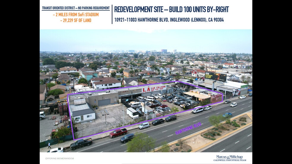 This sale offers the opportunity to purchase a redevelopment site zoned for residential and commercial uses. The site features a by-right buildable density of 150 units per acre (100 units at the subject property), is located in a transit oriented district (no parking requirement), is within a qualified opportunity zone and is proximate to the light rail line and Sofi Stadium.