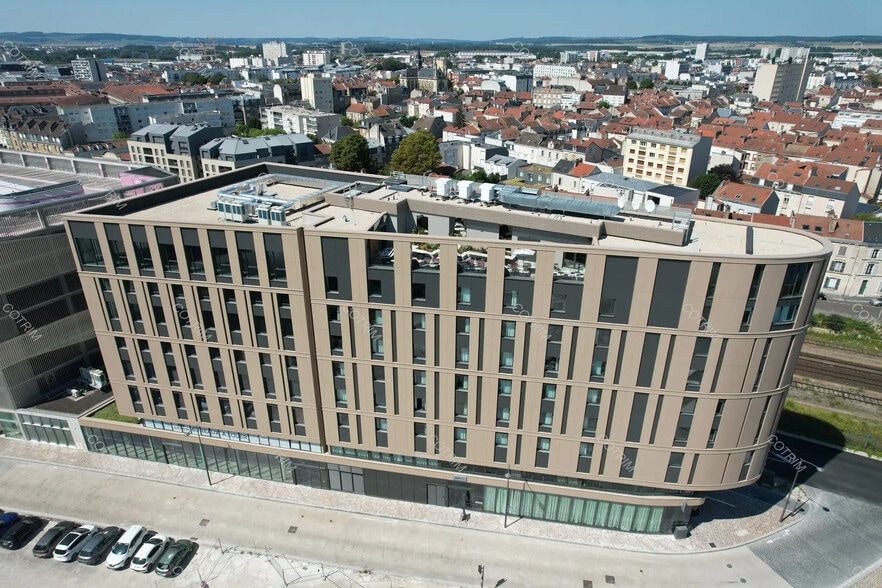 Ensemble de bureaux au sein d’un immeuble contemporain, implanté dans un environnement urbain mixte (services, commerces, logements, hôtellerie et équipements). Accès rapide aux transports et aux principaux axes. Accessibilité Proximité gare Reims Centre Accès gare TGV Champagne-Ardenne Connexion directe aux grands axes autoroutiers Paris à environ 40 min en TGV (selon horaires) Environnement & services Quartier structuré : équipements publics, commerces, logements, hôtel Présence d’espaces de loisirs à proximité Dessertes transports en commun Immeuble / prestations Construction à démarche éco-responsable Terrasse végétalisée Prestations de finition premium (hors cloisonnement) Sécurité : contrôle d’accès + interphone Plateaux Surfaces de bureaux lumineuses, volumes aérés Configuration adaptable selon aménagements preneur