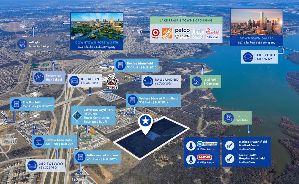 Northmarq is pleased to present Lofts at Grand Prairie, a ±26-acre fully entitled multifamily development site in Grand Prairie, Texas, approved for 676 units across two phases (348 units in Phase I and 328 units in Phase II). The site is conveniently located near Debbie Lane and the 360 Tollway, providing immediate access to the 360 Tollway, I-20, Highway 287, and Highway 161. The subject property’s location allows future residents to easily connect to Downtown Dallas and Downtown Fort Worth, both within 25 miles, as well as DFW International Airport within a short drive. Grand Prairie and Mansfield both continue to attract residents due to their central position between Dallas and Fort Worth, fairly affordable living options compared to Dallas, strong school districts, and immediate access to employment hubs, retail corridors, and regional entertainment anchors that would otherwise require higher housing costs in surrounding cities.