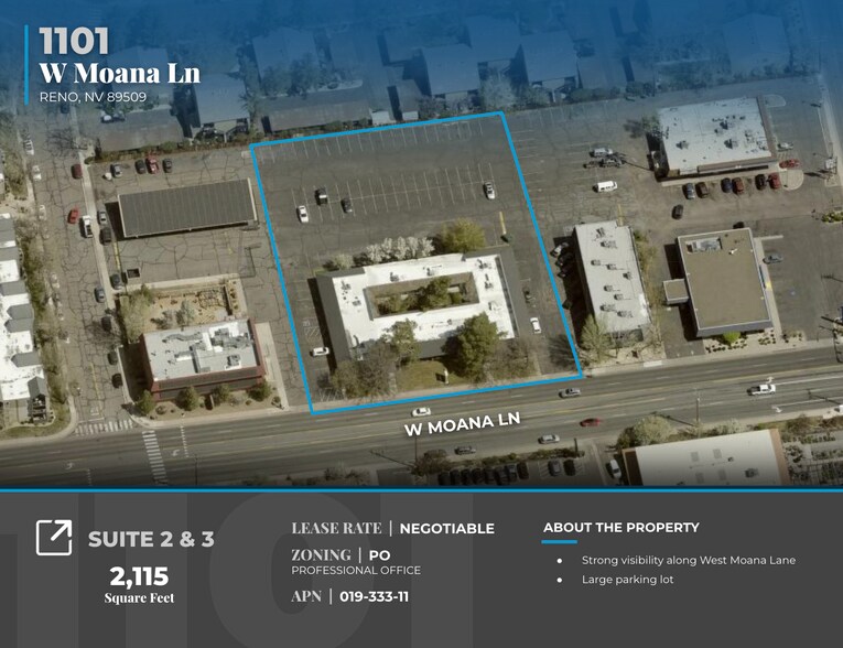 DCG is pleased to offer for lease Suites 2 & 3 at 1101 W. Moana Lane, a centrally located property in Reno. These suites contain 2,115 square feet and benefit from strong visibility along West Moana Lane. The property features a large on-site parking lot, providing convenient access for tenants and customers.