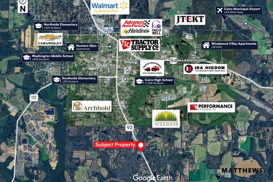 Strategically located along GA-93, the property benefits from excellent visibility and accessibility, serving a strong regional customer base. Cairo is a well-established community with a population of over 10,000 and a diversified economy driven by manufacturing, healthcare, and retail trade. The property is situated just 45 minutes from Tallahassee, FL, and 20 minutes from Thomasville, GA, offering convenient access to major markets.