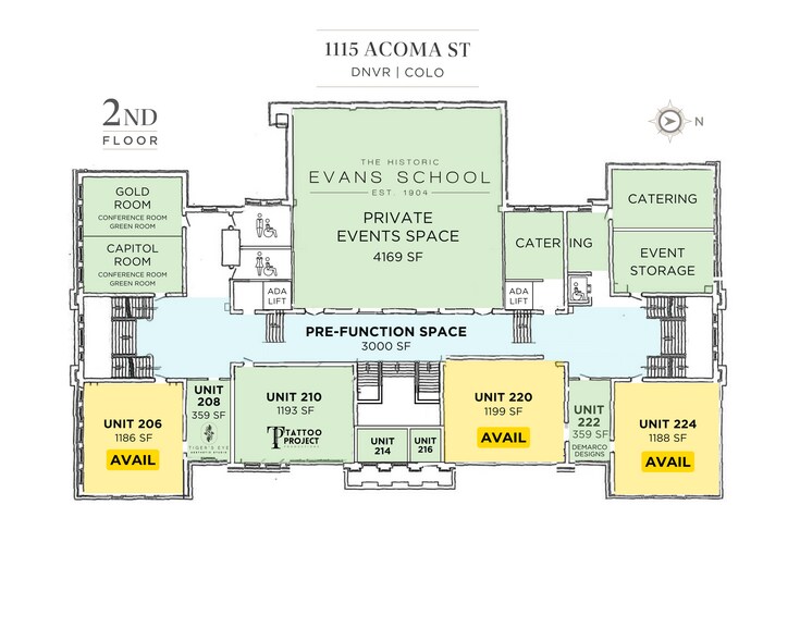 L'école historique Evans, située dans le Triangle d'Or, est en cours de réaménagement et dispose de nombreux espaces disponibles pour les locataires de bureaux, de commerces et de restaurants. La superficie en pieds carrés varie, veuillez appeler pour plus de détails.