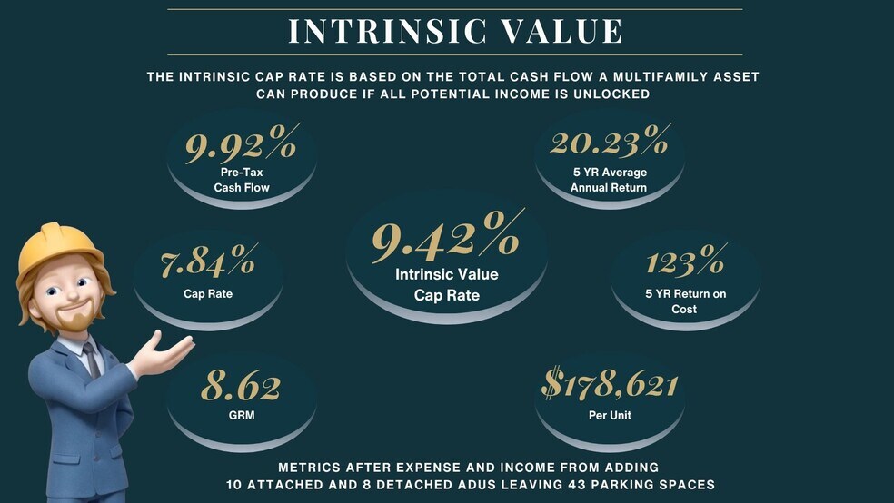 If the investor were to add the ADUs and reach maximum upside in rents, the Intrinsic Value Cap Rate is projected at 9.42%. This reflects the property’s full cash flow potential after optimizing all income streams, such as building the maximum allowed ADUs, reconfiguring floorplans, adding other income (storage/parking etc.) and all are rents at market. Warren Buffet uses the Intrinsic Value when valuing investments.