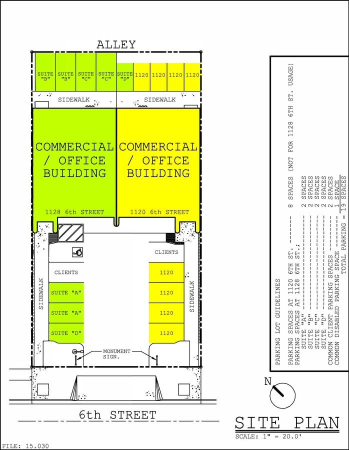 Commercial / Office Space. 1120 6th Street is the south portion of the building. 1st and 2nd floors are available and are offered together. 3230sqft. 1128 6th Street is the north portion of the building. Suite C (2nd floor) is 600sqft and Suite D (2nd floor) is 422sqft. These two suites are across the hallway from each other and are offered separately or can be offered together. Common reception lobby and restroom areas located on the 1st floor. Ready to occupy.