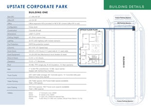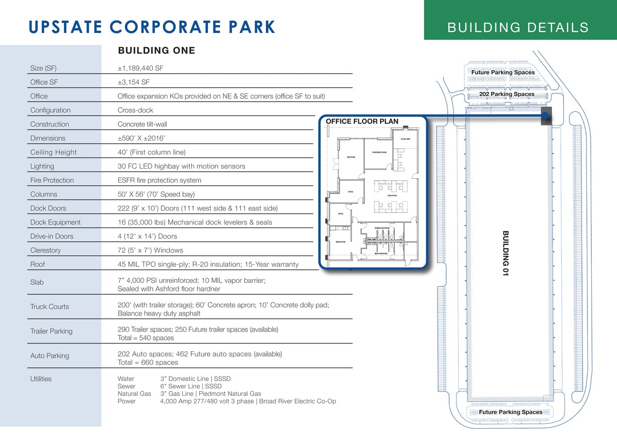 Upstate Corporate Park est un parc industriel à part entière doté d'infrastructures routières et de parcs existantes. Il offre un accès inégalé (1,6 km) à l'I-85, le corridor de croissance explosif du nord de la Caroline du Sud reliant le grand marché du sud-est. Le bâtiment 1 du Upstate Corporate Park, un centre de distribution de ± 1 189 440 pieds carrés, a été soigneusement conçu pour fournir une solution de chaîne d'approvisionnement hautement fonctionnelle et bien positionnée, à proximité d'une population en pleine expansion et offrant un accès à de multiples points de vente logistiques. Bâtiment industriel de classe A de ±1 189 440 pieds carrés Livraison au premier trimestre 2024 Dimensions : 590 pieds x 2 018 pieds Construction : murs inclinables en béton Dalle : pare-vapeur non renforcé de 7 po (4 000 psi) /10 mil Toit : TPO (45 mil monocouche) /isolation R-20/Garantie de 15 ans Arroseurs : ESFR Puissance : 4 000 A 277/480 V triphasé Lumières : LED adaptées Fenêtres : 72 (5 pi x 7 pi) Configuration : Crossdock Hauteur du plafond : 40 pieds (à la première ligne de colonne) Espacement des colonnes : baie de vitesse de 50 pi x 56 pi/70 pi Portes de quai : 222 (9 pieds x 10 pieds) /111 du côté est/111 du côté ouest Portes d'entrée : 4 (12 pi x 14 pi) Terrains pour camions : 200 pieds avec rangement pour remorques/tablier en béton de 60 pi/support pour chariot en béton de 10 pieds Stationnement pour caravanes : 540 places au total (290 places pour caravanes et 250 places pour caravanes futures) Stationnement automatique : 660 places au total (202 places automobiles et 462 places automobiles futures) Tous les utilitaires disponibles Emplacement : Upstate Corporate Park est stratégiquement situé sur la SC-110, juste au nord de l'Interstate 85 dans le comté de Spartanburg. Le bâtiment 1 se trouve à ±2 km de l'I85 (sortie 83), ±11 miles de Spartanburg, ±14 miles de l'I26, ±25 miles de BMW, ±30 miles de l'aéroport international GSP et du SC Inland Port-Greer, ±39 miles de Greenville et de l'I385, ±70 miles de Charlotte, NC et ±180 miles d'Atlanta, GA.