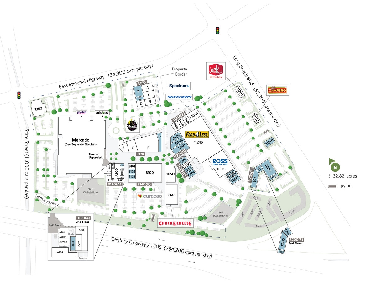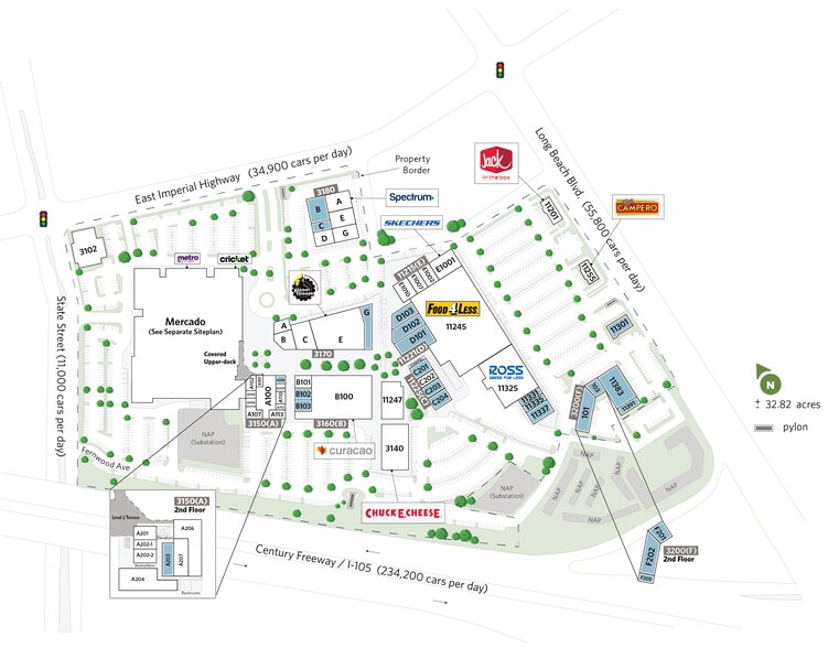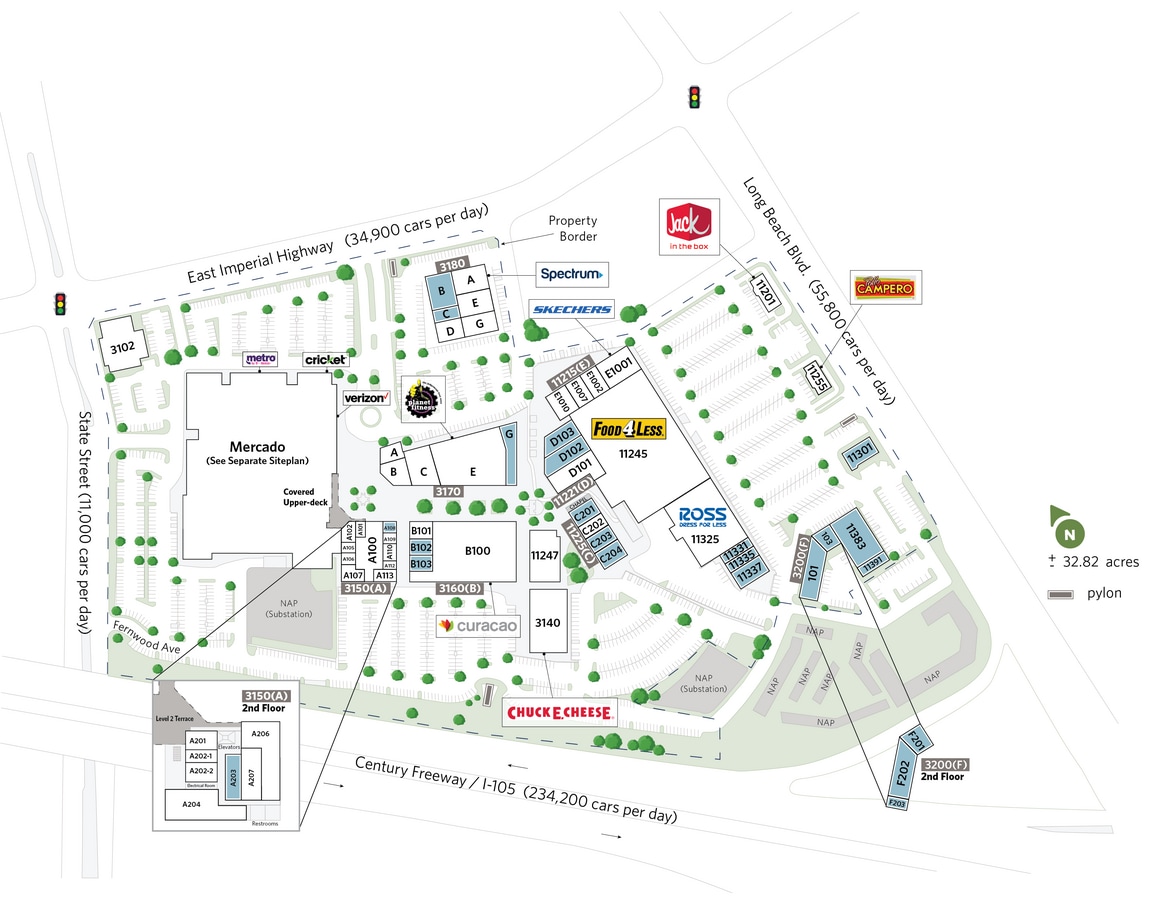 Le Plaza Mexico est un centre communautaire de 403 242 pieds carrés basé sur l'épicerie situé dans la MSA de Los Angeles, en Californie. La propriété constitue une pièce maîtresse pour la communauté environnante et bénéficie de plus de 1 500 pieds de façade le long de l'Interstate 105 très fréquentée (342 000 voitures/jour). L'établissement propose des points d'ancrage permanents tels que Food 4 Less, Rite Aid, Planet Fitness et La Curacao, en plus d'un Mercado très apprécié dans la région composé de plus de 200 vendeurs. En raison de sa liste de locataires et de sa position au sein de la communauté, l'établissement accueille près de 6,5 millions de visiteurs par an qui fréquentent le centre pour faire des achats et assister aux événements et rassemblements organisés sur place. Les routes très fréquentées qui entourent la propriété desservent la communauté dense de près d'un million de personnes vivant à moins de 8 km du site. Une culture dynamique et la proximité du centre-ville de Los Angeles vous invitent à visiter la ville de Lynwood. La communauté a quelque chose pour tout le monde, y compris une cuisine variée, des lieux de divertissement et une vie nocturne. L'une des premières choses que vous verrez en entrant dans Lynwood est son propre château d'eau qui s'élève parmi les nombreux appartements et bâtiments commerciaux. Au fur et à mesure que vous vous promenez, vous verrez des zones résidentielles parfaitement alignées et de vastes espaces urbains se mêlant les uns aux autres. Cette banlieue offre non seulement une diversité culturelle, mais aussi un mode de vie sain rempli de verdure à Lynwood Park, d'espaces ouverts et de piscines. Des restaurants se trouvent le long de ses principales artères et les résidents ont un accès direct aux autoroutes 105 et 210. Les moyens de transport disponibles à Lynwood incluent la gare de Long Beach, à 1,6 km, le stade Long Beach-Daugherty Field, à 16 km, et l'aéroport international de Los Angeles, à 22 km. Le centre compte 5 parcs dans un rayon de 14 miles, dont le parc d'État Watts Towers-Rodia, le Watts Senior Center & Rose Garden et le parc naturel de Compton Creek à l'école primaire George Washington.