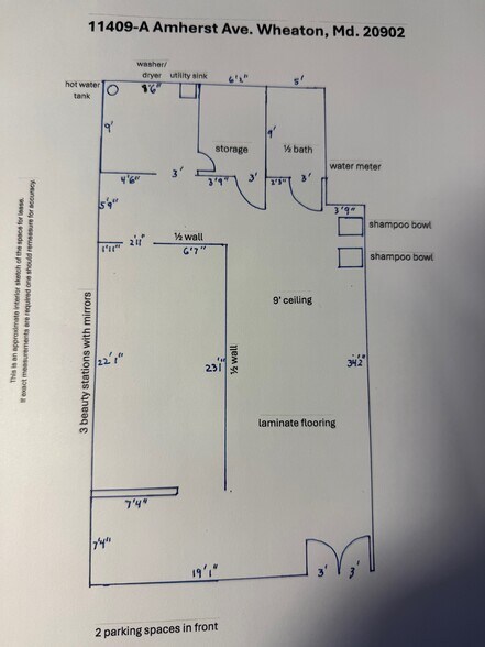 11409 A Amherst Avenue, Wheaton, MD 20902 AVAILABLE: +/- 1,230 s.f. and currently operating as a hair salon. Space contains wide open retail space with some half walls (see floor plan), 9’ drop ceiling with lights, laminate floor, 2 shampoo bowls, three stylist stations, stackable washer and dryer, utility sink, hot water heater, storage room and a ½ bathroom. Current tenant will move out once a replacement tenant is found. Signage available on the building facade facing Amherst Ave. and a pilon sign visible from University Blvd. Tenant will have 2 on-site parking spaces. Street metered parking also available. ZONING: Wide variety of retail / office / medical / restaurant uses are permitted. No convenience store, food sale or alcoholic beverage uses are permitted for off-site consumption. LEASE PRICE: Total rent is $3,446 per month, plus utilities. LOCATION: Located about a hundred feet from the intersection of University Blvd. and Amherst Ave. and next to the Wheaton Post Office. Call Larry Rosen Commercial and Investment Realty for details 301-793-8901.