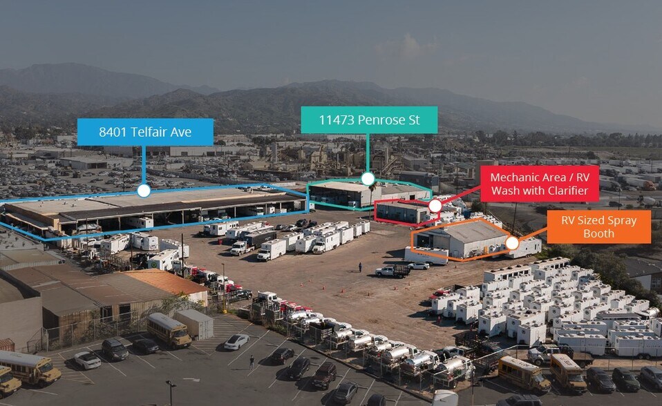 Position your operations at 11473 Penrose Street, a premier industrial site in the heart of Sun Valley offering unmatched functionality and convenience. Spanning 5.3 acres with approximately 65,000 square feet of building area, this property is designed to accommodate a wide range of industrial uses. Strategically located with immediate access to the I-5 Freeway, the property ensures seamless connectivity to Greater Los Angeles and beyond. The fully fenced and paved yard enhances security and operational efficiency, while multiple ground-level loading doors streamline freight movement. Additional buildings include a dedicated mechanic area with RV wash and clarifier and an RV-sized spray booth.