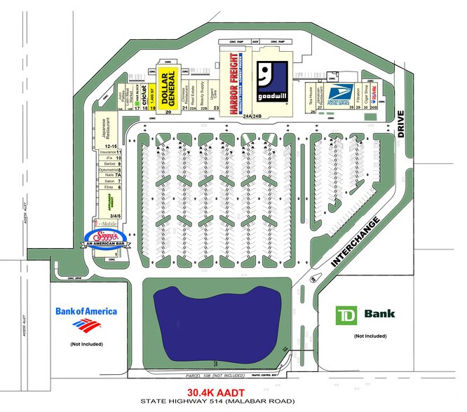 Espace commercial à louer à Interchange Square, propriété de Gator Investments, à Palm Bay, en Floride. Interchange Square est situé juste au sud de Melbourne, sur Malabar Road, juste à l'ouest de l'I-95, dans le comté de Brevard. Centre commercial très visible avec un trafic de plus de 50 000 voitures par jour et un accès facile à une intersection signalisée. Des panneaux de signalisation sont disponibles. Rejoignez Goodwill, Dollar General, Harbor Freight Tools, USPS, H&R Block et Appliance Direct ! Le centre est situé en face de Home Depot, Publix et Lowe's.