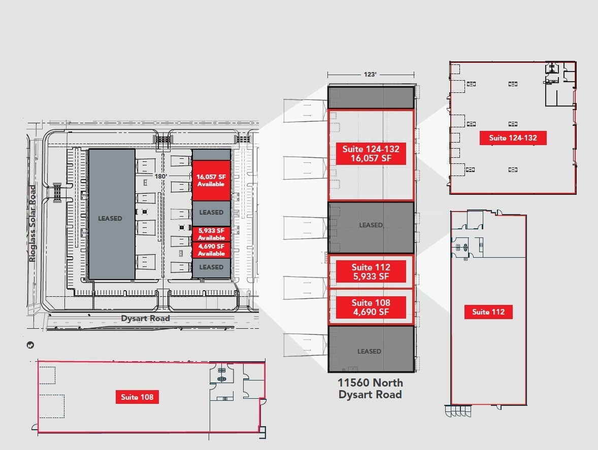 16,057 SF available 3-grade level doors 3-dock high doors The site is strategically located less than five miles between Loop 303 and Loop 101, offering direct access to the Northwest corridor of the Greater Metro Phoenix area. This central connection features logistical advantages to industrial users with the capability to serve numerous large urban areas located within a one-day and two-day delivery zone.