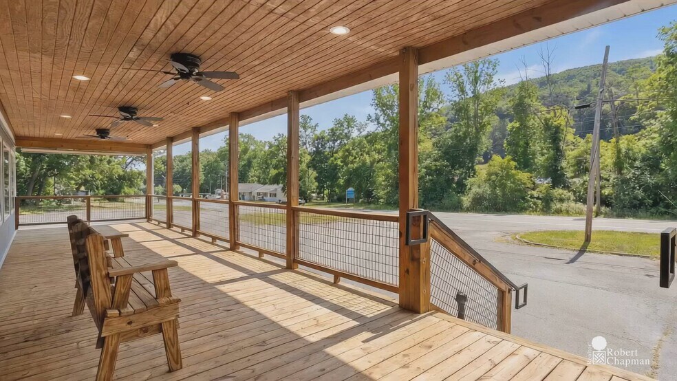 Outdoors, a generous covered porch provides seating for an additional 30+ dining guests. The property boasts the second-largest paved parking lot in Sperryville, offering space for 20+ vehicles. The site also includes a valuable grandfathered billboard sign—an entitlement that would be un-buildable under today’s zoning regulations.