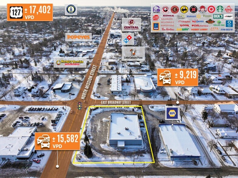 Mount Pleasant, Michigan is the county seat of Isabella County in central Michigan and serves as a regional hub for the surrounding trade area. Demand is anchored by Central Michigan University’s main campus (a major year-round population driver) and the nearby Soaring Eagle Casino & Resort, which supports hospitality, entertainment, and employment activity. For developers, the market typically underwrites well for workforce and student-adjacent multifamily, neighborhood retail/services, and light industrial/flex tied to local employers and regional distribution. With convenient regional access, about 70 miles to Lansing, Mount Pleasant can function as a cost-effective infill and redevelopment market with steady, institutional demand generators. The Property is located less than a mile from Central Michigan University, the main economic engine for the submarket. The immediate vicinity features a mix of national and local retailers including Meijer, Walmart, Kohl’s, Target, Starbucks, Walgreen’s, CVS, Dick’s, Hobby Lobby, McDonald’s, Harbor Freight, Wendy’s, Popeyes, Napa, Subway, KFC, and more. The surrounding ±5-milei trade area is home to 38,448 residents with an average household income of $63,208.
