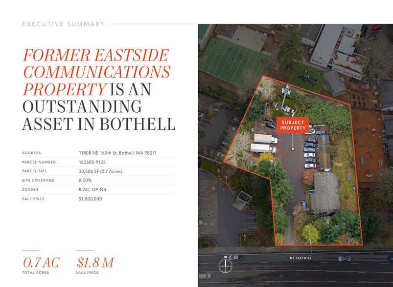 The Former Eastside Communications Property is a ±0.70-acre redevelopment site located just off I-405 in Bothell, offering excellent access and long-term development flexibility. The property is zoned R-AC, OP, and NB, supporting a wide range of residential, office, and mixed-use development scenarios. With minimal existing site coverage and strong assemblage potential with the adjacent office property, the site is well positioned for higher-density residential or mixed-use redevelopment as surrounding activity continues to grow.