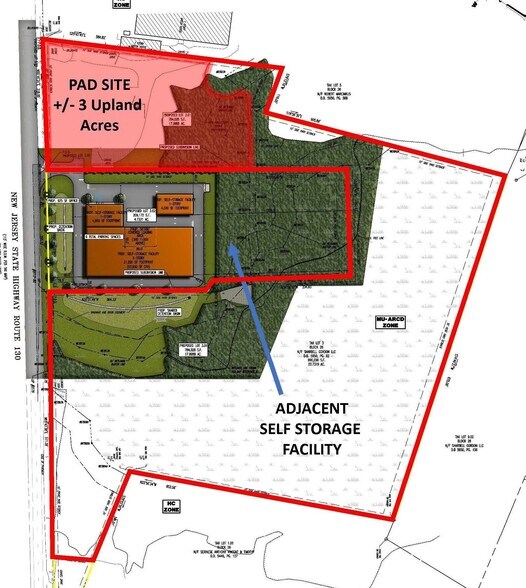 17.98 acres with +/- 3 acre upland development pad site abutting the newly built Extra Space Storage facility on busy highway Route 130 in Robbinsville Township, NJ.