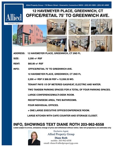 12 HAVEMEYER PLACE, GREENWICH, CT. BUREAUX/RETAIL À 23 MÈTRES DE GREENWICH AVE. ANCIENNE CASERNE DE POMPIERS RÉNOVÉE ET TENDANCE. DISPONIBLE MEUBLÉ OU NON MEUBLÉ. **INFORMATIONS SUR L'ESPACE AU REZ-DE-CHAUSSÉE :** 1 200 +/- RSF X 25 $/RSF = 2 500 $/MOIS. 1 200 +/- RSF X 3 $/RSF POUR LES CHARGES = 300 $/MOIS. 1 PLACE DE PARKING INCLUSE DANS LE LOYER. ESPACE RÉCEMMENT RÉNOVÉ. ASCENSEUR DEPUIS LE HALL PRINCIPAL DIRECTEMENT DANS L'ESPACE. + PORTE D'ENTRÉE PRIVÉE DONNANT DIRECTEMENT À L'EXTÉRIEUR. 2 GRANDES PIÈCES + SALLE DE BAIN NEUVE. **INFORMATIONS SUR L'ESPACE AU 2ÈME ÉTAGE :** 2 200 +/- RSF X 68,50 $/RSF = 12 558,33 $/MOIS. LE LOCATAIRE PAIE 1/3 DES CHARGES (GAZ/CHAUFFAGE, ÉLECTRICITÉ ET EAU). PAS DE PLACE DE PARKING DISPONIBLE POUR LE 2ÈME ÉTAGE. GRANDE SALLE DE CONFÉRENCE/ESPACE MULTI-BUREAUX. ZONE RÉCEPTION/ACCUEIL. QUATRE BUREAUX INDIVIDUELS. + UN GRAND BUREAU EXÉCUTIF/SALLE DE CONFÉRENCE. DEUX SALLES DE BAIN. GRANDE CUISINE AVEC COMPTOIR CAFÉ ET PLACARD DE RANGEMENT. **POUR PLUS D'INFORMATIONS OU VISITES, CONTACTEZ DIANE ROTH AU 203-962-6558.** Annonce sujette à erreurs, omissions, modifications de prix et retrait sans préavis.