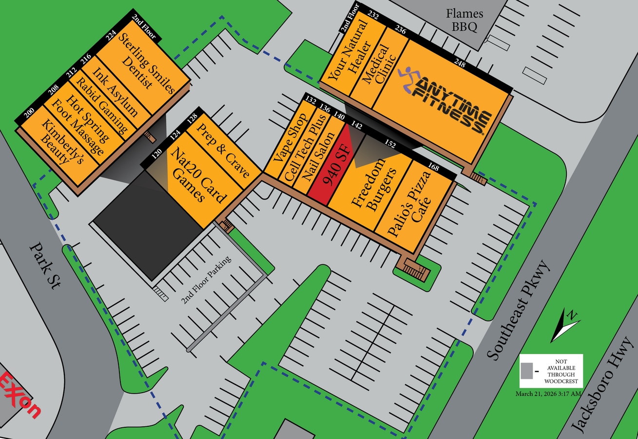Park Place Plaza est un centre commercial de quartier de deux étages d'environ 28 000 pieds carrés situé juste à côté de l'autoroute 199 à Azle, au Texas. Azle est situé à 26 km du centre-ville de Fort Worth, dans le coin nord-ouest du comté de Tarrant. Ce centre comprend le Palio's Pizza Cafe, Anytime Fitness et bien plus encore. Les suites commerciales de ce centre sont disponibles à la location pour tout, des vitrines traditionnelles aux restaurants, en passant par les bureaux, les fournisseurs de services médicaux ou autres prestataires de services professionnels. Woodcrest Capital accueille les nouvelles entreprises et les entreprises franchisées dans ses centres avec des baux faciles à lire et des conditions flexibles. Woodcrest est également suffisamment sophistiqué pour plaire aux plus grands locataires du crédit national. Entreprise familiale spécialisée dans l'immobilier commercial depuis plus de 40 ans, Woodcrest possède et exploite tout, des centres de classe A situés dans les quartiers les plus fréquentés aux centres en difficulté qu'elle réhabilite dans des communautés rurales en difficulté. Appelez-nous dès aujourd'hui pour trouver le bon emplacement pour votre entreprise, car nous avons généralement plusieurs opportunités de vente au détail dans les environs immédiats !