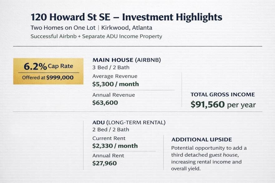 Airbnb +ADU Income Property-2 Homes 1 Lot 120 Howard St SE 2 Lot Offre d’immeuble d’habitation à 862 007 € à un taux de capitalisation de 6,17 % Atlanta, GA 30317