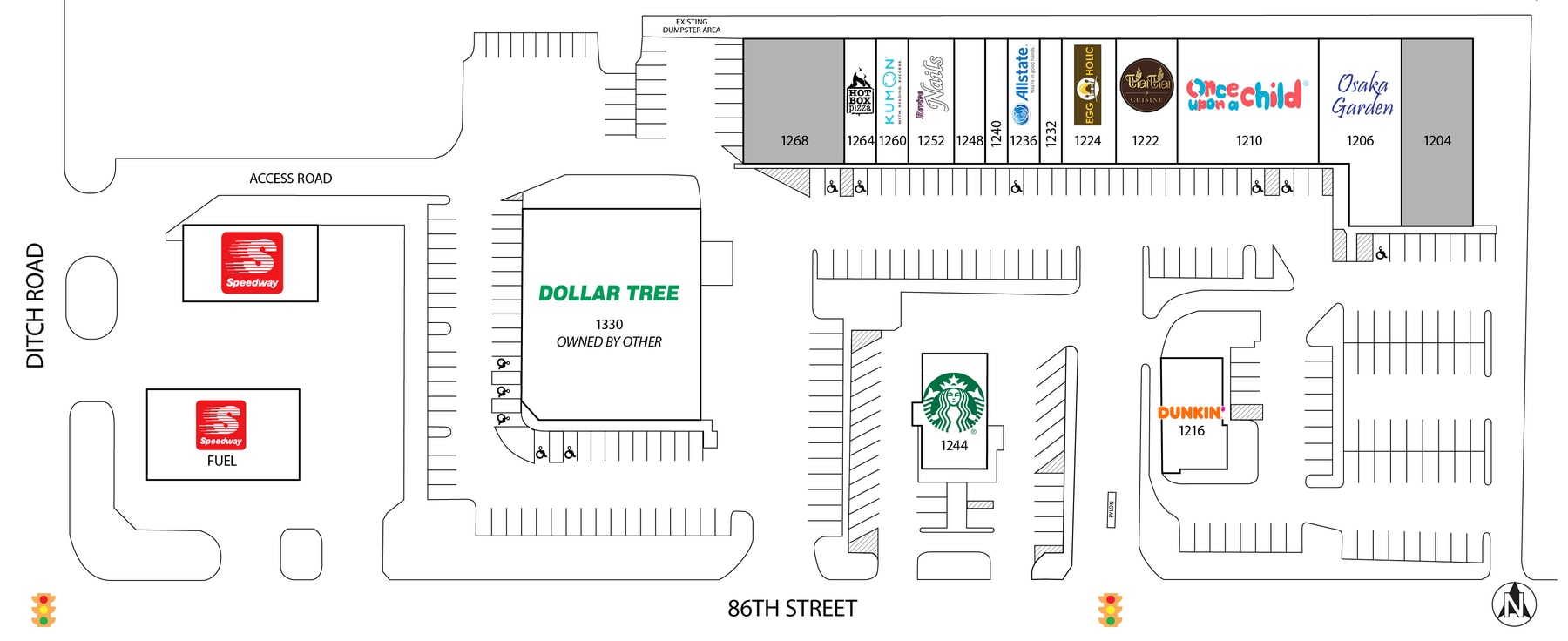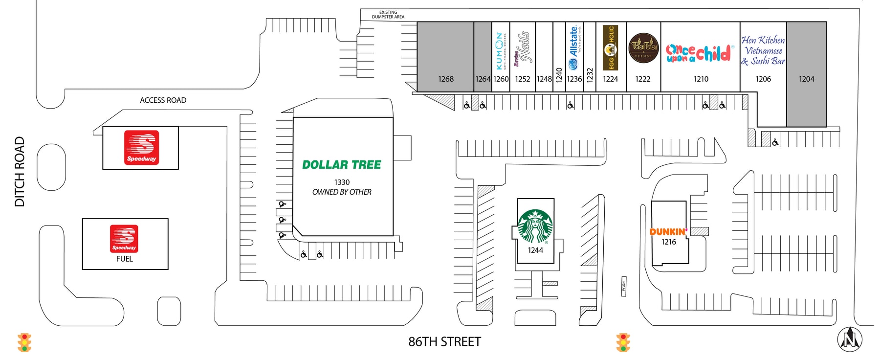 Centre commercial idéalement situé à moins de 1,6 km à l'est de l'hôpital Saint-Vincent Situé dans un quartier animé et aisé du côté nord Espace d'extrémité très visible disponible Circulation quotidienne : 31 833 sur la 86e Rue et 14 357 sur Ditch Road