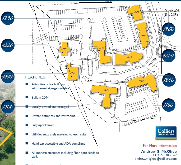 Le Hartsville Professional Village bénéficie d'un emplacement central dans le comté de Bucks, idéalement situé pour répondre à vos besoins professionnels. L'établissement est situé le long de York Road (route 263), d'Easton Road (route 611) et de l'échangeur Willow Grove du péage de Pennsylvanie (sortie 343). À quelques minutes en voiture du village, vous trouverez de nombreuses commodités, notamment le quartier culturel de Doylestown, le palais de justice du comté de Bucks, des hôpitaux agréés, des centres commerciaux, des clubs de golf et des restaurants raffinés. Old York Road et York Road à Warminster