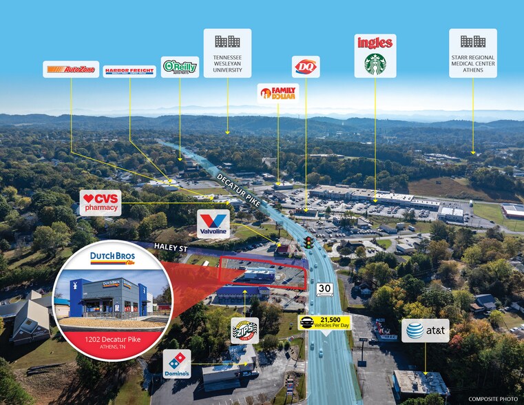 The rare oversized 2,573 SF building with a double drive-thru is located on the morning side hard corner of Decatur Pike and Haley Street and is located between the cities of Knoxville and Chattanooga. The property is located between Tennessee Wesleyan University (approx. 1,400 students Enrolled) and McMinn County High School (approx. 1,500 students enrolled). The property is also situated approx. half a mile from Starr Regional Medical Center.