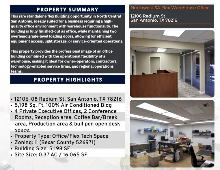 5,198 SF stand-alone flex industrial office building offers a unique blend of executive office presence and warehouse functionality . The building is 100% air-conditioned and fully built out with a professional office finish, featuring a reception area, four private executive offices, two conference/meeting rooms, a board room, administrative offices, bullpen open workspace, copy room, coffee bar and kitchen/break area, along with ample storage and a dedicated utility room. While configured as high-quality office space, the property maintains true operational capability with two grade-level overhead garage doors, providing efficient shipping, receiving, light storage, and equipment access. Situated on a 0.37-acre (16,065 SF) site with frontage on Radium Street and dual curb cuts for convenient ingress and egress, the property is zoned I-1 (Bexar County 526971) and is ideally suited for owner-operators, contractors, technology-enabled service firms, and regional operations teams seeking both image and functionality. The location offers exceptional connectivity near Highway 281, Loop 410, and San Antonio International Airport, positioning businesses within one of the city’s most accessible industrial corridors. The property is available immediately at $16.00 PSF NNN, with estimated operating expenses of approximately $4.07 PSF, and heavy tenant improvement allowance available for qualified tenants.