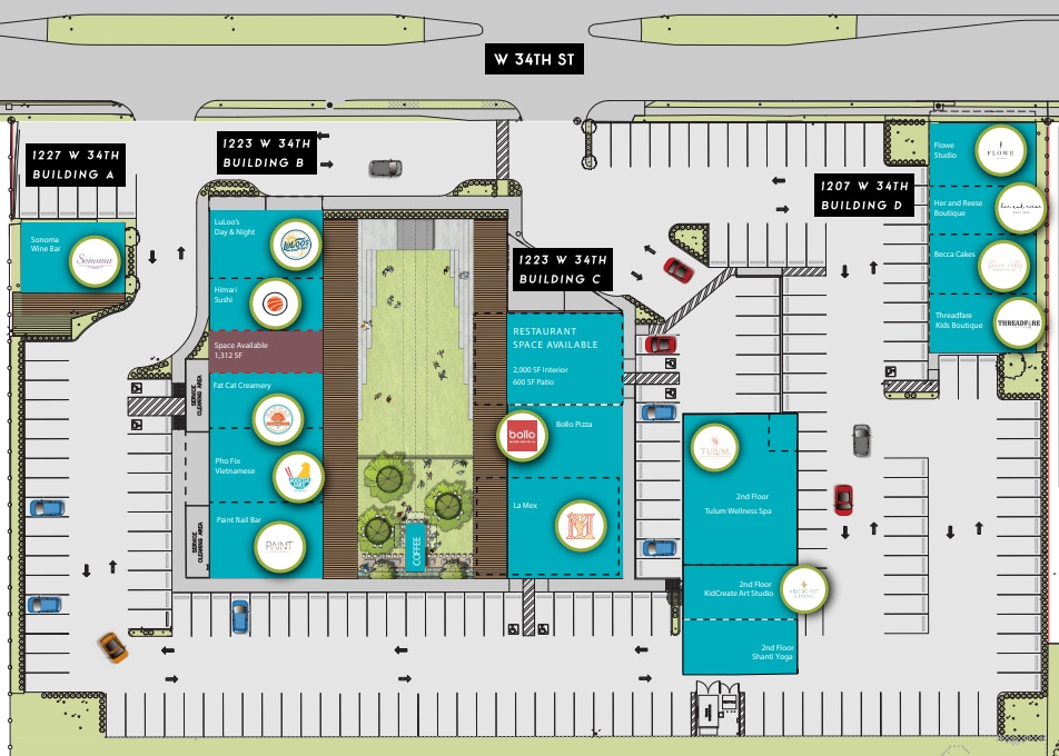 - Features include a premium covered patio area, prominent pylon signage, and visibility to over 15,000 daily vehicles along W 34th Street.